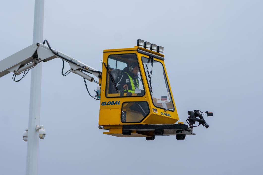 与流亭机场相比,胶东机场更为开阔,风更大、湿度更高,对航空器除霜提出了更高要求。清晨的寒风刺骨,赵航登上除冰车吊篮,系好安全带、戴上耳机,缓缓升至离地五米左右的高度,对准飞机的大翼、尾翼精准喷射。白色雾气在晨光中升腾,仿佛为飞机披上一层“隐形铠甲”。