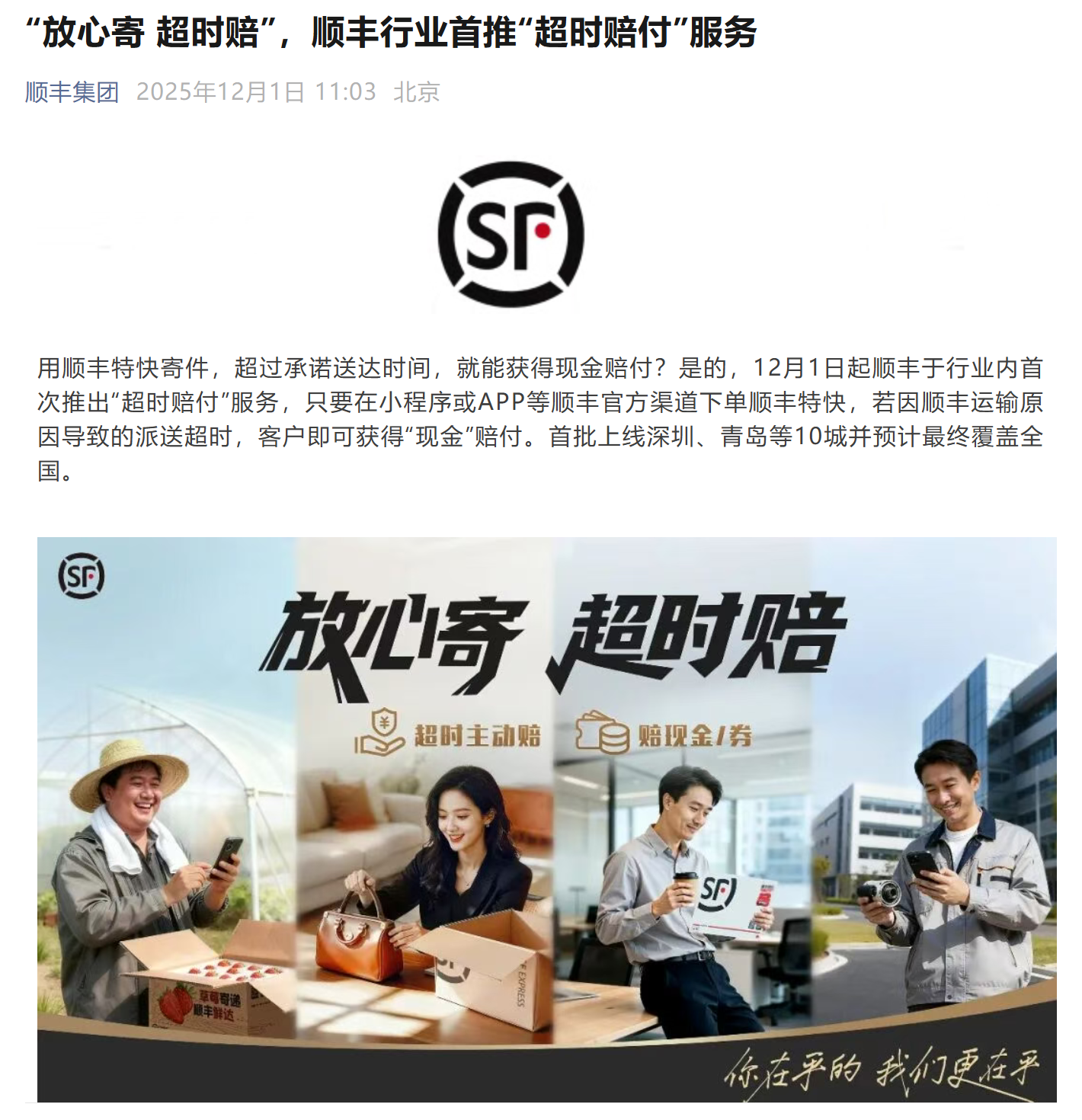 12月1日,顺丰集团官微表示,12月1日起,将推出“超时赔付”服务,只要在小程序或APP等顺丰官方渠道下单顺丰特快,若因顺丰运输原因导致的派送超时,客户即可获得“现金”赔付。首批上线深圳、青岛等10城并预计最终覆盖全国。顺丰称,此次服务在赔付定责方面,也绝非简单归咎于个人,公司将基于大数据系统,对快件流转的全环节进行智能分析与责任拆解,通过技术和管理升级来解决问题。并且此项赔付产生的成本完全由公司承担,快递员无需承担任何赔付责任或赔偿。