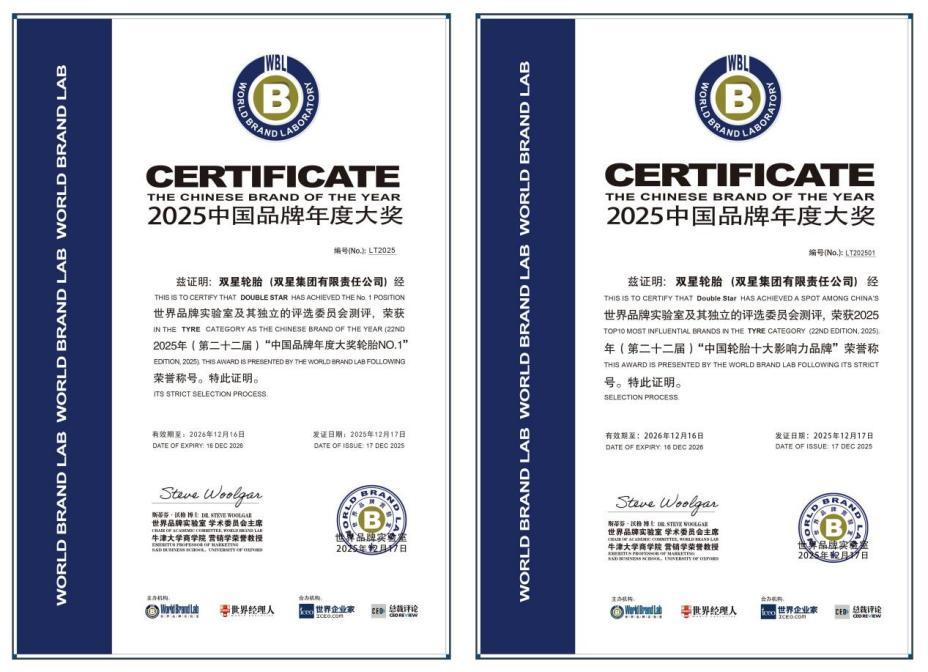12月17日,由世界品牌实验室主办的2025年世界经理人峰会在香港举行。会上公布了2025年“中国品牌年度大奖”等评选结果。双星轮胎与华为、雪花、徐工等35个活跃在2025年度中国经济舞台的领军品牌入选,荣获“中国品牌年度大奖轮胎NO.1”、“中国轮胎十大影响力品牌”荣誉称号。